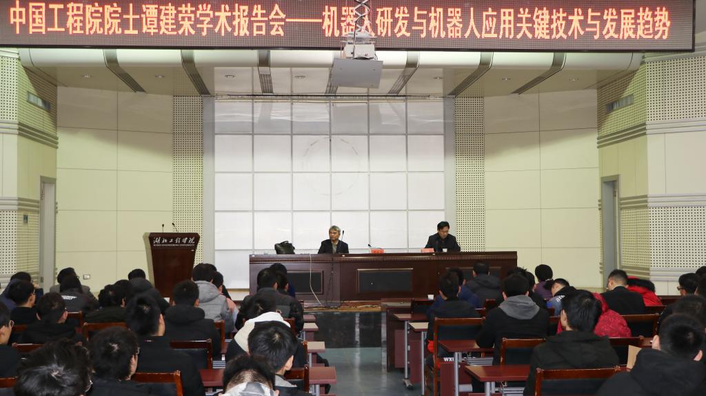 121日下午, 中国工程院院士谭建荣应邀来到我校作题为“机器人研发与机器人应用关键技术与发展趋势”的学术报告。我校党委书记彭瑜出席并主持报告会,副校长李渺、9428cn太阳集团古天乐党总支书记、执行院长盛继群及相关专业近300名师生聆听报告会。