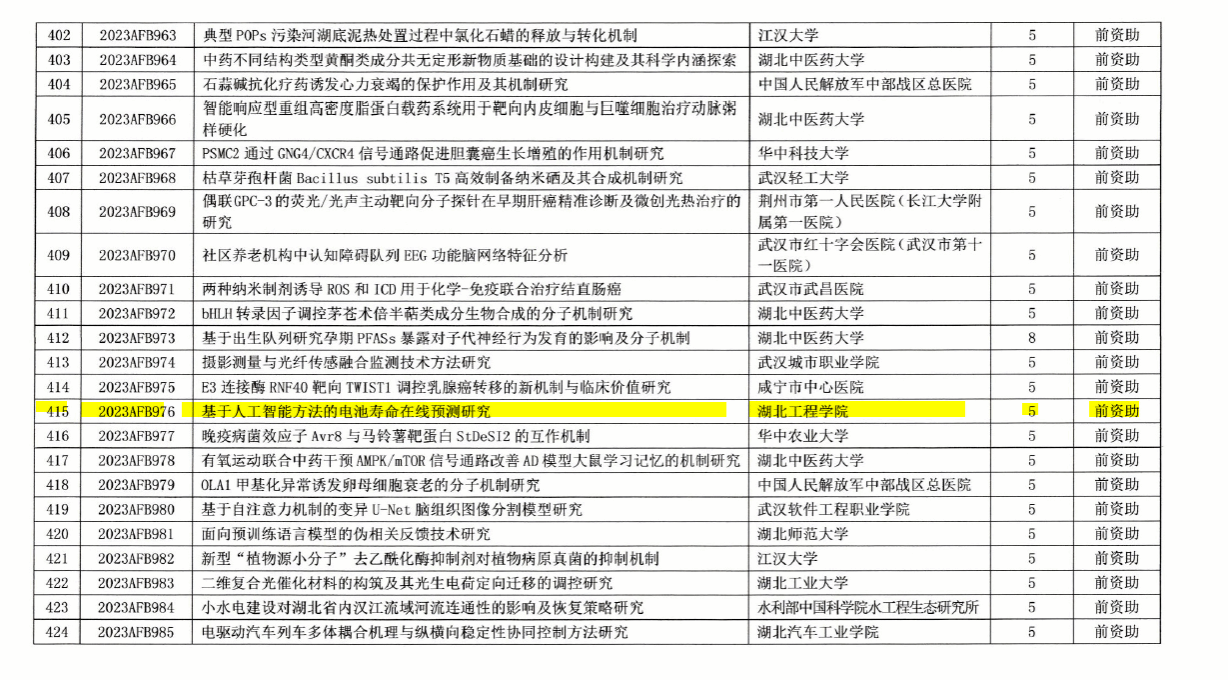 近日,湖北省科技厅布了《省科技厅关于下达2023年省自然科学基金计划项目的通知》,我院共有2项课题获批立项,分别是熊巍博士的《基于人工智能方法的电池寿命预测研究》和魏可可博士的《考虑流水孔溢流的潜艇上浮动运动特性研究》项目。
