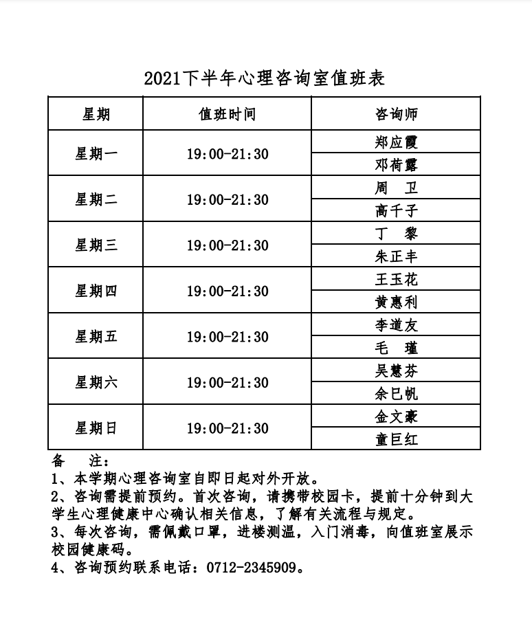9428cn太阳集团2021年下半年心理咨询室值班表