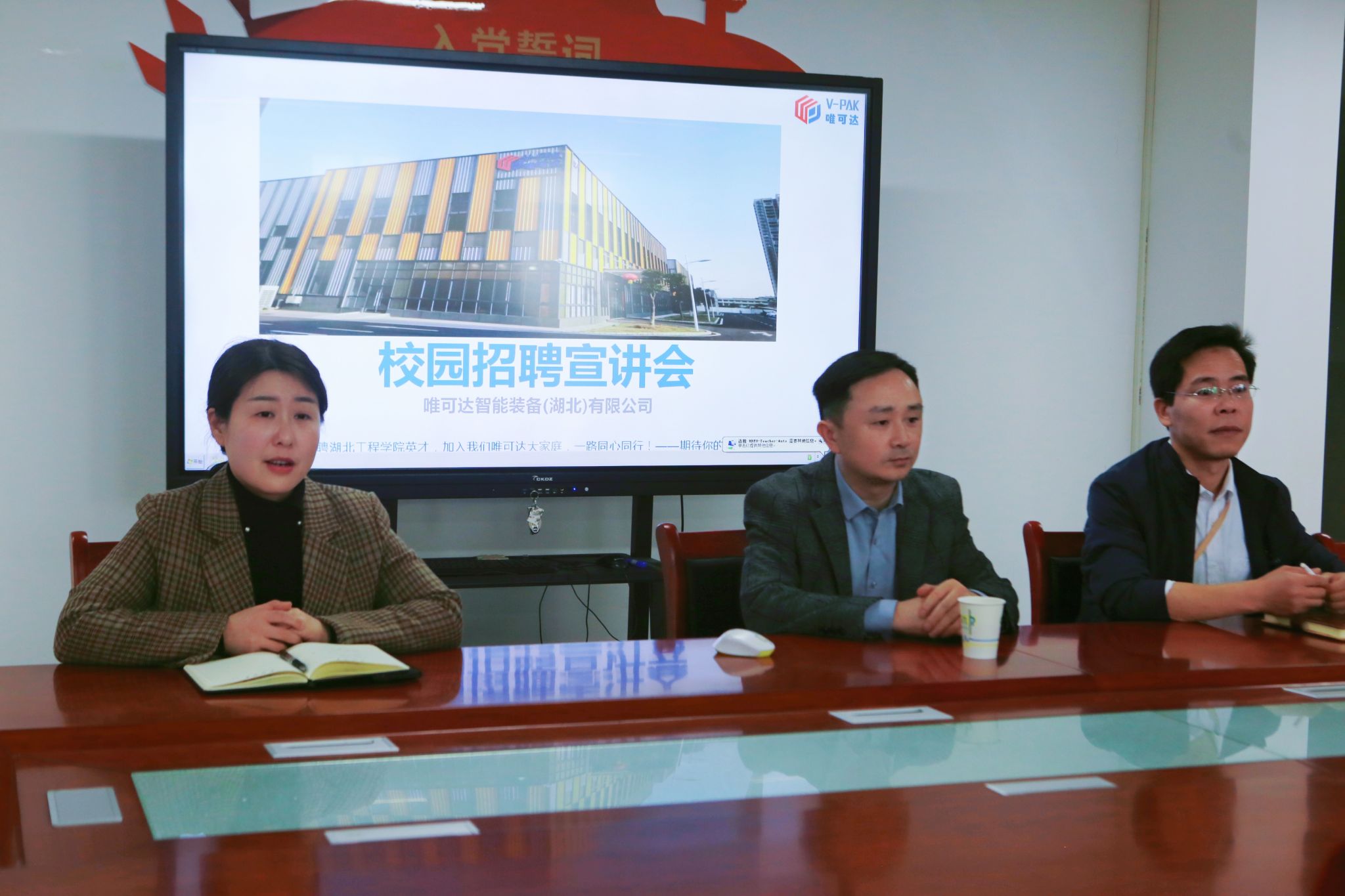 为进一步贯彻落实上级部门相关决策部署,做好当前和今后一段时期毕业生就业工作,我院多渠道开拓就业岗位,邀请企业进校开展专场校园招聘。3月22日下午,唯可达智能装备(湖北)有限公司在三园区1号楼413会议室举办专场招聘宣讲会,唯可达智能装备(湖北)有限公司董事长张艳洋、技术部经理侯修卫及人事行政主管张红伟参加会议,毕业年级辅导员及2024届在校学生参加了会议。会议由学院党委副书记杨晓薇主持。