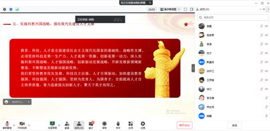 徐刚同志以“学习二十大 永远跟党走 奋进新征程”为主题,用党的二十大报告概述开篇明义,以党的二十大报告要点为主线、重点对党的二十大精神的丰富内涵和核心要义等方面进行了详细解读,着重从二十大报告提出的“实施科教兴国战略 强化现代化建设人才支撑”方面,结合实际工作对二十大报告进行了深入浅出的解读,为大家上了一堂生动而深刻的专题党课。