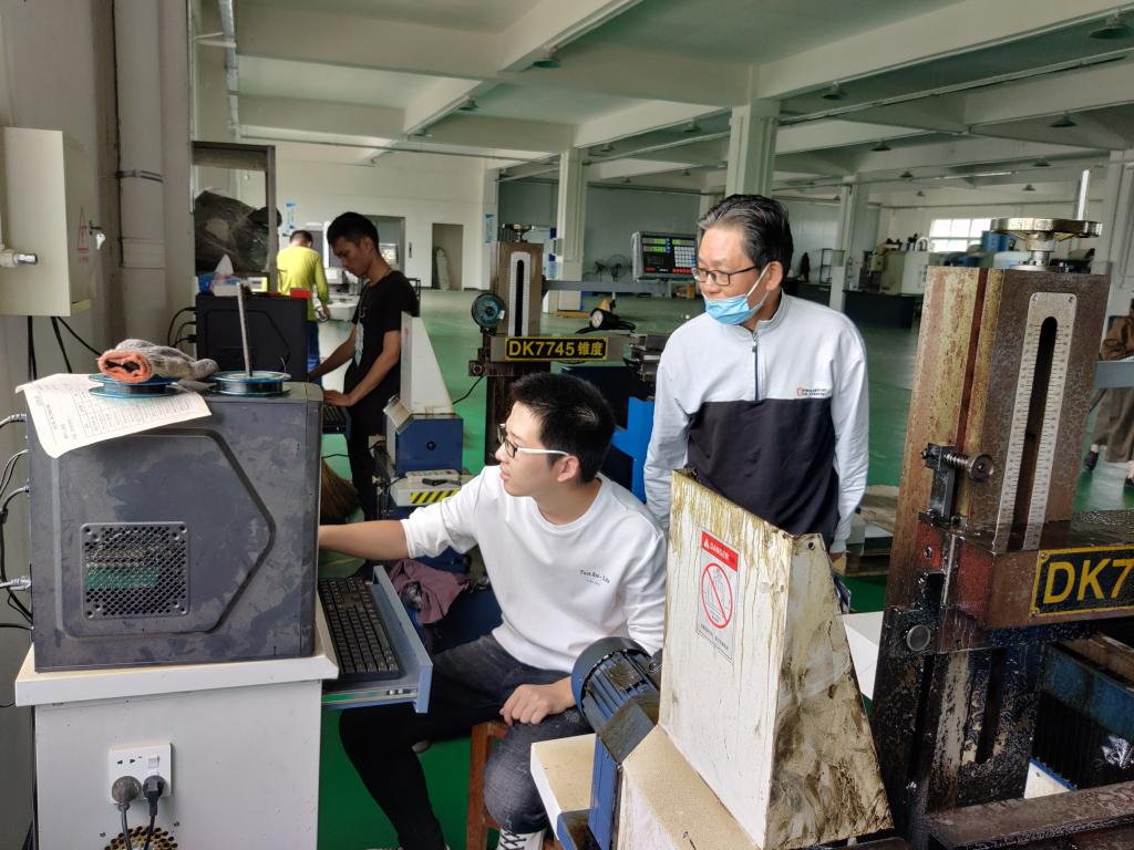 盛继群到车间看望正在实习的学生,现场了解实习内容,询问学生实习感受与困惑。